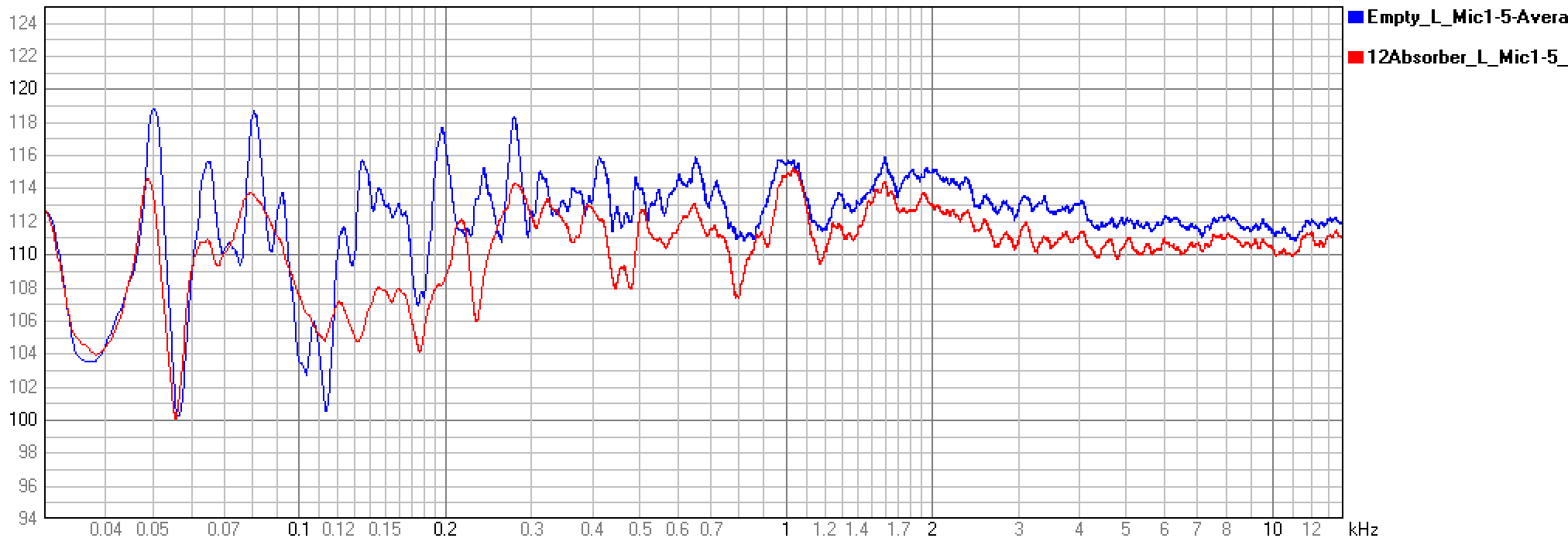 Der Gesamt-Pegel liegt im leeren Raum fast 2 dB über der Situation mit Absorbern. Die rote Kurve zeigt also für mittlere und hohe Frequenzen fast nur noch den Direktschall, während bei der blauen Kurve auch die vielen Reflexionen und der Nachhall Einfluss hat.