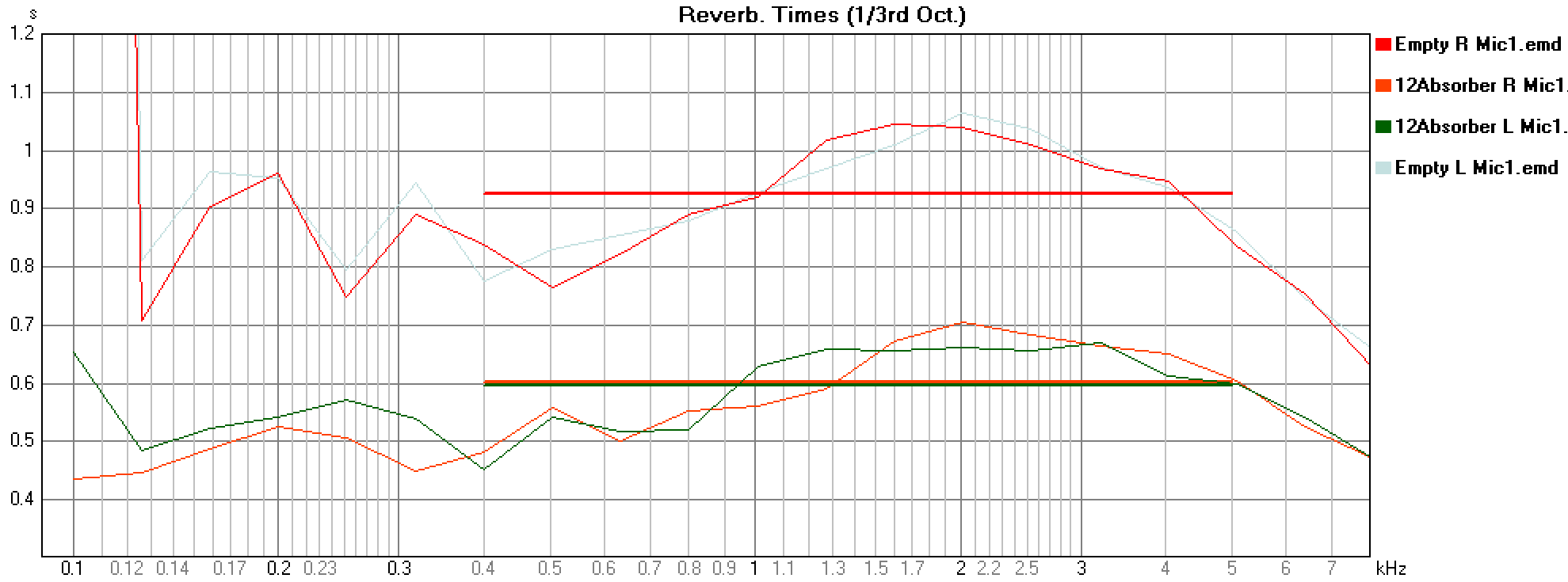 Zunächst ein Wort zum Verfahren: normalerweise benutzt man zur Messung der Nachhallzeit (T30) einen omnidirektionalen Lautsprecher (meist Dedokaeder), der Schall gleichmäßig in alle Richtungen abstrahlt. In meinem Fall habe ich einfach meine normalen Lautsprecher verwendet. Die ermittelten Zeiten sind also absolut gesehen nicht ganz korrekt. Dennoch sind die Unterschiede zwischen leerem und vollem Raum so groß, dass wir für unsere Zwecke alles ablesen können, was für uns wichtig ist.
