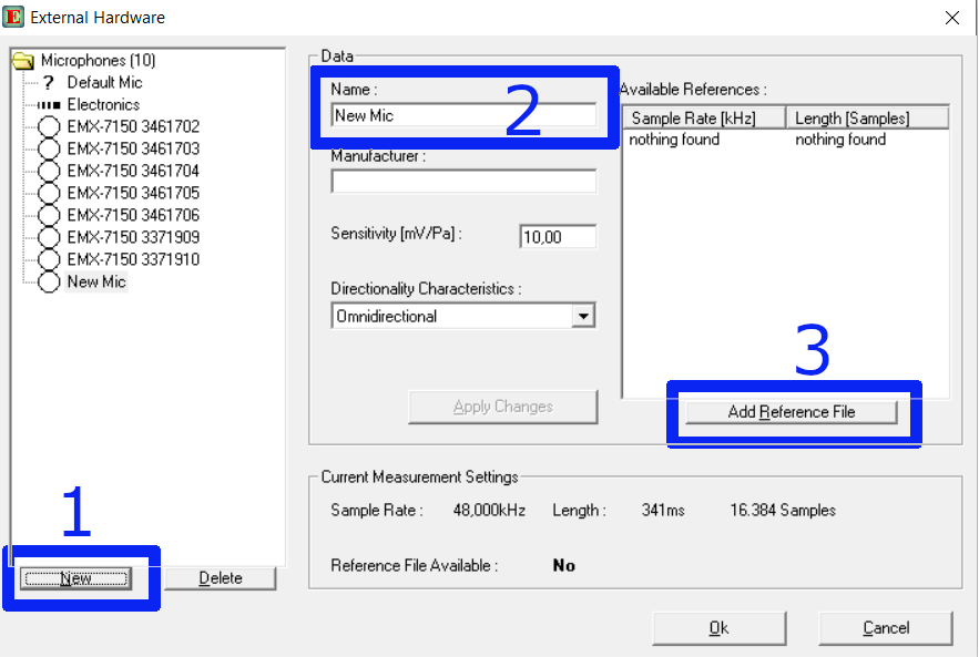 Ein Klick auf den New-Button (1) legt ein neues Mikrofon an. Es empfiehlt sich, zunächst den Namen abzuändern (2). Für jedes Mikrofon können anschließend die Referenz-Dateien hinzugefügt werden (3). Hier suchen wir zunächst den passenden Ordner und wählen dann bei Datei-Format alle Dateien *.* aus.